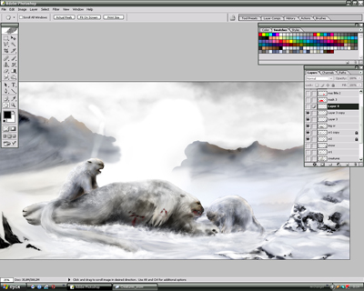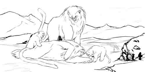 В данном уроке я объясню и покажу создание работы «Снежные львы» от эскиза и до полного завершения. Конечно, законченных работ не бывает, но можно приблизиться к очень и очень приличному результату, чтобы не стыдно было выкладывать в галерею;) Я буду рассказывать какие инструменты и техники применять, на какие моменты обращать внимание, и как довести работу до завершающей стадии. Вы увидите как может отличаться законченная работа от эскиза и поймете, почему так происходит (может произойти). Придумывая рисунок, я решил изобразить прайд снежных львов: самка тяжело ранена в битве и вокруг нее стоят лев и два львенка). Снежный лев – существо, придуманное мной из симбиоза белого медведя и льва. Для начала создайте новый пустой файл размером 3200 на 1800 (можно больше. Тут все зависит от производительности компьютера). Итак, начнем с эскиза. (Изучая урок вы можете не слепо копировать работу, а нарисовать что-то свое в рамках данного стиля. Принципы работы будут актуальны для рисования большинства работ в таком стиле и сеттинге.). Для начала в общих чертах набросайте эскиз композиции. Можно просто грубо накидать месторасположения существ, окружения и пр. Потом высветлить слой (нажмите ctrl + U и сдвиньте вправо ползунок lightness ) и создать новый слой над старым ( ctrl + shift + N ). На новом слое отрисуйте эскиз немного более детально, но не углубляйтесь в подробности. Они не понадобятся на данном этапе и вообще это будет лишняя трата времени. Отрисовка деталей предстоит позже.