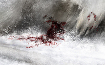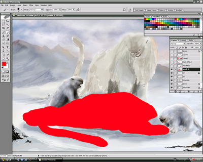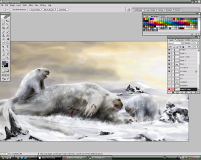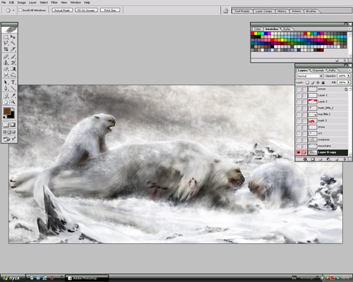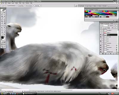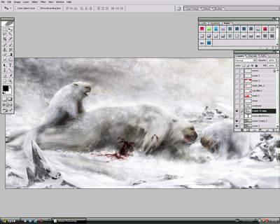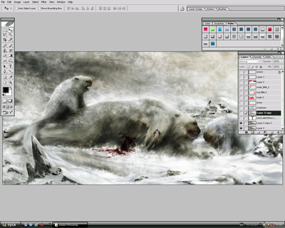 Можно добавить еще один пустой слой и доработать бурю, если какие-то моменты Вас не устраивают. Нет предела совершенству!) Теперь настало время объединить слои и обработать их вместе. Выключите все вспомогательные слои и нажмите Ctrl + Shift + E . Слои сольются в один слой. Теперь дорисуйте стекающую кровь на животе львицы и лужу крови на снегу перед ней, обработайте инструментом Smudge tool шерсть в том месте, где львенок слева опирается на львицу, чтобы граница не была резкой. Вообще аккуратно пройдитесь Smudge tool по всем местам, которые Вы считаете нужным обработать. Потом поверх создайте пустой слой и нарисуйте снег над областью с кровью и неми областями, которые вы обрабатывали, чтобы избавиться от смазанных границ, выбивающихся из общей массы. Вновь объедините слои.
