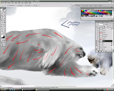 И начинайте «приглаживать» шерсть, теперь уже учитывая ее направление. Размер кисть поставьте не слишком маленький и не слишком большой - 10-11 px . Ниже показано направление движения штрихов инструментом Smudge tool . Следите, чтобы шерсть приобретала более-менее реалистичный оттенок, а не была просто «размазней». Не тяните кистью слишком долго. Небольшие короткие штрихи дадут вполне приличный результат.