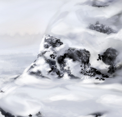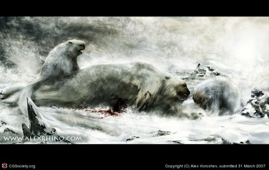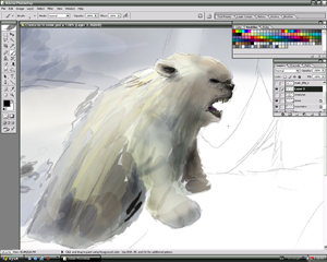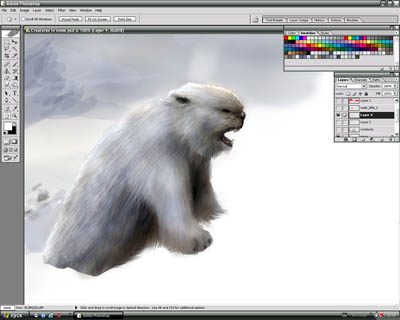 Здесь я решил пересмотреть композицию картины и убрал стоящего позади львицы самца. Это добавляет драматизма в сюжет. Львята кажутся более беззащитными. В любой картине имеет большое значение не только качество работы, но и ее эмоциональное восприятие. Можно долго отрисовывать каждую шерстинку, но не добиться желаемого результата, а можно сделать несколько штрихов, но создать настроение. Помните об этом;) Настало время заняться слоем Background . Перейдите к нему и нарисуйте снежный покров. Для этого используйте кисть с мягкими краями и уровнем Opacity 28%. Отмечайте темные и светлые места и затем создавайте между ними более-менее мягкое перетекание. Можно пользоваться градациями серого цвета, а потом раскрасить кистью в режиме Color . Это и проще и удобнее. И Вам не надо будет мучиться, подбирая цвет. Сейчас главное – рельеф. Камни нарисуйте кистью небольшого размера с уровнем Opacity 100%. Выберите черный цвет и нарисуйте область камня. Затем белым и серым цветом поставьте несколько (3-4) белых или серых пятна. Выберите Smudge tool и кисть, которую Вы использовали в работе над шерстью. Легкими движениями создайте фактуру камня. Не обязательно прорисовывать каждый скол. Просто сделайте так, чтобы он казался объемным и рельефным. Обработайте снег и камни инструментом Smudge tool , чтобы подчеркнуть рельеф и смягчить переходи. Уровень давления инструмента – 70-80%.