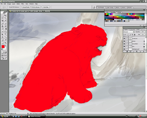 Теперь переходим к работе с цветом. Создайте новый слой под слоем с эскизом. Назовите его Color . Для эскиза установите уровень Opacity около 60%. (не рисуйте на слое Background !) Выберете кисть с мягкими краями и грубо накидайте общую цветовую гамму будущей работы. Не старайтесь передать цвет так, как он будет выглядеть в окончательной работе, но и не халтурьте. У Вас должно получиться нечто подобное: