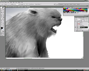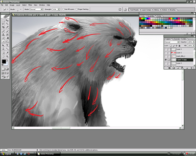 Назовите слой Small 1. Нажмите Ctrl + Shift + U для того, чтобы перевести слой в оттенки серого. На данном этапе цвет нам не нужен. Прорисуйте кисточкой с жесткими краями детали мордочки. Затем пройдитесь по слою обычной круглой кистью с уровнем Opacity 80, прорисовывая шерсть львенка. На данном этапе не нужно дотошно прорисовывать каждый волосок. Сейчас нас интересует только направление шерсти, ( Обратите внимание на гипотетический источник света и направление ветра, учитывая куда будет загибаться или приглаживаться шерсть и как будет расположена светотень ).