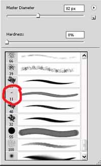 В моем случае ветер дует справа налево и шерсть у молодого львенка, находящегося слева загибаться не будет, а наоборот будет прижата к телу, кроме густой шерсти на лопатках, на щеках и тд. Закончив с нанесением рисунка шерсти перейдем к ее отрисовке. Выберите инструмент Smudge tool (палец) и установите для него давление 80%. Затем выберите кисть, показанную на рисунке ниже. Это стандартная кисть.