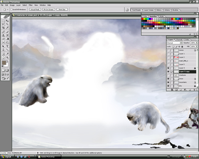 Вместо намечавшихся на заднем плане гор я решил нарисовать небо и метель. Во-первых это визуально приближает и ограничивает основную часть композиции, во вторых – избавляет от не несущих смысловой нагрузки деталей и пространства. Поверх всех слоев создайте пустой слой (назовите его Snow ) и нарисуйте на нем снег, лежащий на спинах львов, снег, лежащий возле лап и живота и тд. Для этого можно воспользоваться стандартными кистями. А можно и создать свои кисти. Хороший урок по кистям Photoshop можно найти здесь Ваша задача на данном этапе работы – нарисовать снежную бурю на слое Snow и Background . Меняйте размер, Opacity и форму кистей для достижения наилучшего результата. Учитывайте направление ветра и форму объектов (кое-где шерсть будет сбиваться в кучки, например возле лап, в правой части хвоста львицы и тд). Результат должен получиться примерно таким: