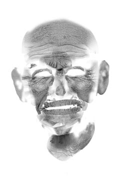 Для создания седых волос я дублировал слитые вместе слои с морщинами и лицом, и перевёл в ч/б. Потом открыл Levels (Ctrl+L) и перетащил ползунок Highlight влево. Вся кожа стала абсолютно белой, а волосы стали серыми.