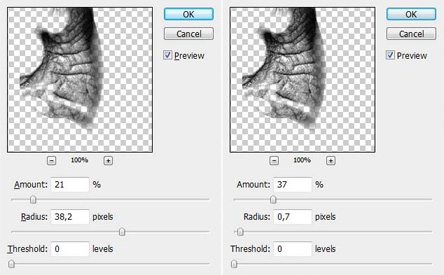 У всех морщин, которые были здесь использованы, я повысил контрастность и резкость, и сделал это следующим образом:
