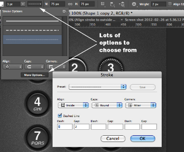 В добавок к новой функции векторных контуров Photoshop CS6 позволяет добавить обводку к вашему вектору более эффективно. Вы, возможно, уже видели видео, как создавать пунктирные линии. Возможность создавать пунктиры превосходна, но Photoshop CS6 позволит вам делать гораздо больше. Вы можете выровнять обводку по внутреннему/внешнему краю, по центру контура и при этом углы будут острыми, что не всегда получалось в предыдущих версиях программы.