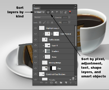 - Сортировать слои по типу/пикселям/настройкам/тексту/фигурам...